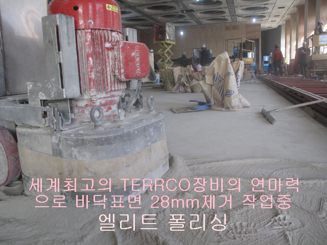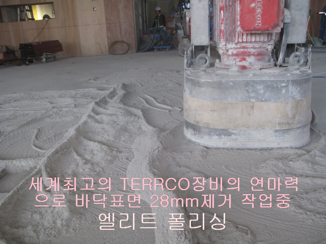 동대문 두산타워 세계최고 연마력 Terrco 장비 콘크리트바닥 15mm 종석에 28mm 제거작업