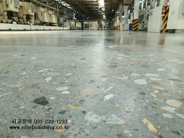 기존 에폭시 바닥일때의 기름때 오염와 바닥이 일어나 먼지가 발생하는